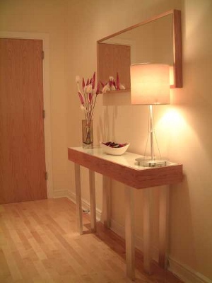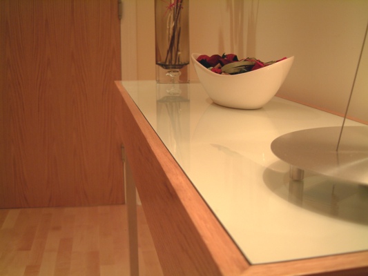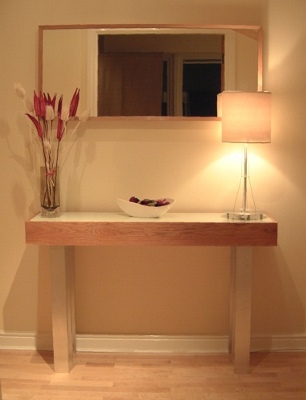 A delicately proportioned console table. The natural rich texture of the Oak frame is complimented by the smooth white centre panel, with a pane of clear glass adding crispness to the design. The trio of slim pure Aluminium legs at each end gives the table a particularly modern style. Available in natural Oak colour, or rich dark stained Oak (see the Cafia coffee table for the dark Oak colour) |